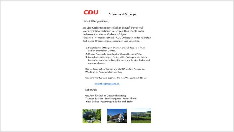 die CDU Ottbergen möchte Euch in Zukunft immer mal wieder mit Informationen versorgen. Dies könnte unter anderem über dieses Medium erfolgen.